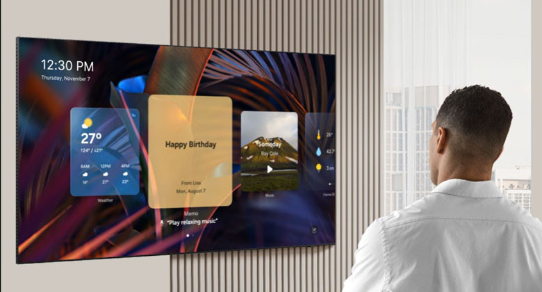 Hiển thị các tiện ích trên TV suốt cả ngày. Ngay cả khi màn hình tắt, TV có thể phát hiện người dùng ở gần và tự động kích hoạt để hiển thị Bảng Thông Tin Hàng Ngày (Daily Board). Bạn có thể tùy chỉnh với các tiện ích như Thời tiết, Ghi chú, Âm nhạc và hơn thế nữa. Bảng Thông Tin Hàng Ngày cũng có thể kích hoạt rảnh tay bằng giọng nói.